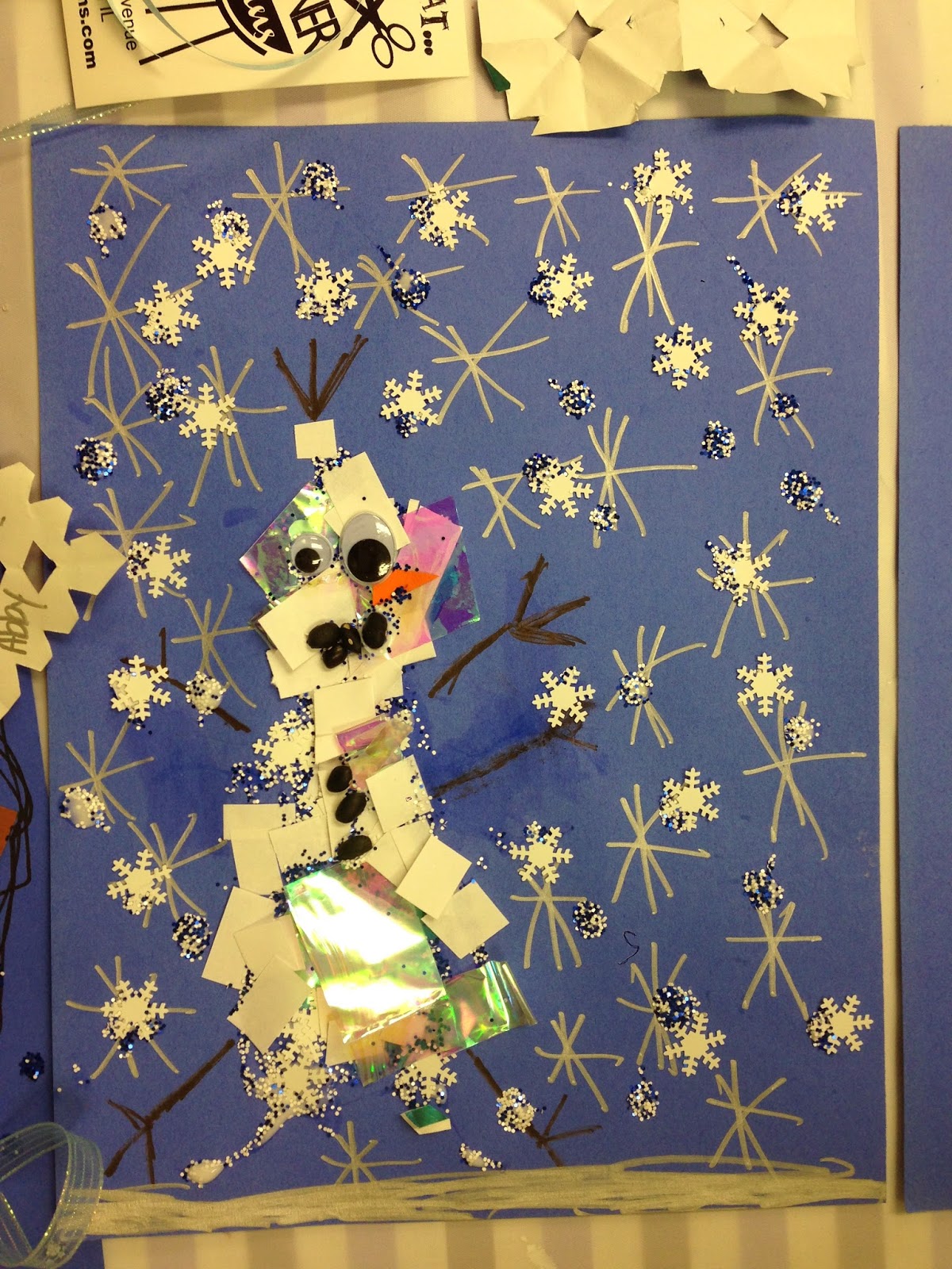 We cleaned up our wands and got ready for our real project...Do you want to build a snowman?  Using Olaf as our guide, the girls built a snowman collage.  I sometimes teach a variation of this lesson to kindergartners during my normal public school teaching. I was SOO afraid we were going to run out of time during the party, that I kind of over prepared and it. Instead of running out of time, we had a ton of time leftover.  Ooops.  Do not do that with a group of wild 8 year old girls.