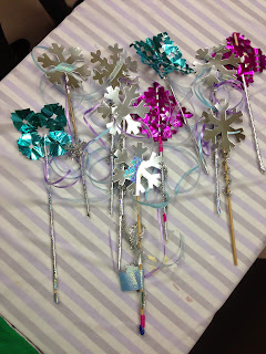 Knowing my class would be wildly excited 8 year old girls lead most of my decision for these projects.  When the girls arrived they built and designed their own Snow Queen Wands.  I stocked up on silvery shiny papers, streamers, ribbons, duck tape, and a die-cuts.  I taught the girls how to cut snowflakes as they arrived.  It was differentiated!