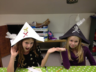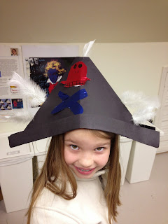 For one class, we concentrated on Pirates!  We made these really cute pirate hats as our warm-up.  I taught the kids how to make a skull & cross bones, but they could decorate them any way that they liked.