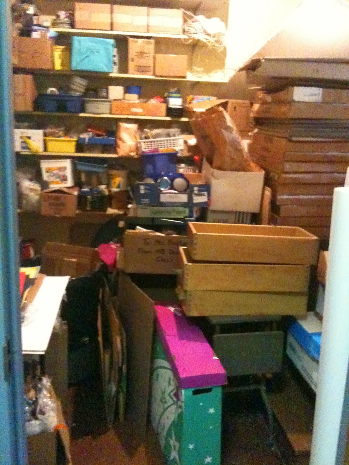 Oh, did I neglect to mention the storage closet I have upstairs? Yes, about 100 feet away and up 18 steps is my own special, locked storage room. This has been a great place to dump EVERYTHING. Someone gives me a bag of weird Styrofoam? Throw it upstairs. Four bags of fabric scrap? Throw it upstairs. Newspapers? Curling ribbon? You name it. I would also store legitimate stuff up there too. Extra construction paper, 18 x 24" anything, pastels, glue, and a ton of embellishments. It's been a nuisance when I have to run up there in the middle of a class, but it has been a great catch-all.