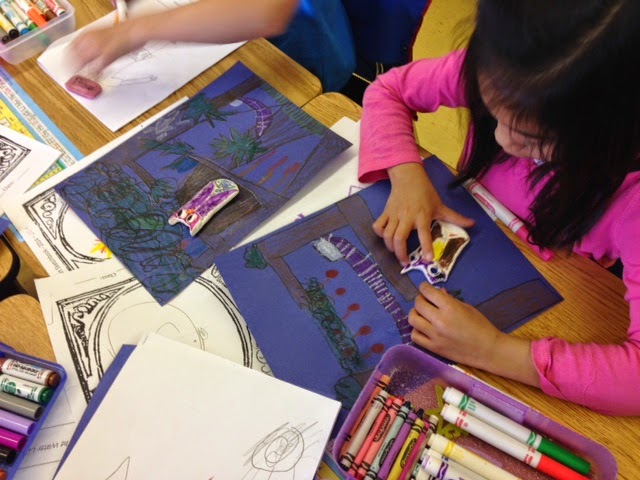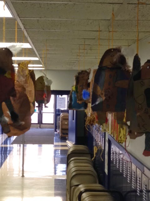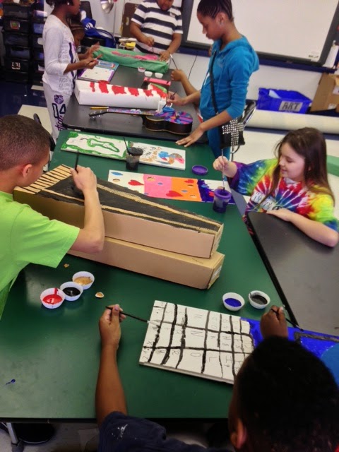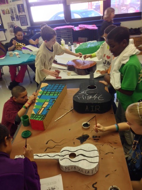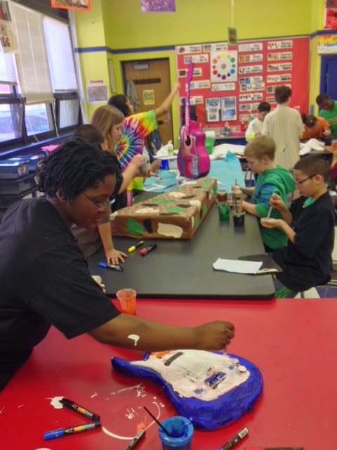 I divvied my collection up by class, so my later afternoon class would have as much chance of getting to decorate a Bass as my morning class. In total I had 3 Acoustic Guitars, 1 acoustic bass, 2 electric Basses, 2 Ukes, 2 Guitar boxes, 2 Guitar cases, 7 Uke boxes, and 9 pieces of wood from an old book shelf that fell apart. Of course the kids were most excited about the guitars. However, the pieces of wood were also a big draw. This lesson could be modified with so many different everyday objects. I was teaching high school during the time of the original "Cows on Parade" and we made plaster casts of our heads and hands on parade!