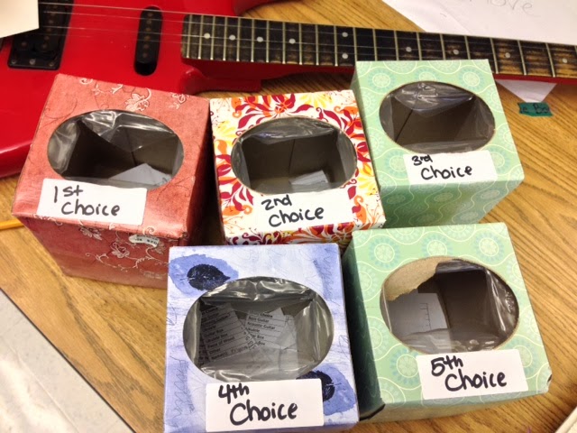 The students witnessed the selection process and most were fine with what they got. A few students became unhappy with their group, because they realized only one student would be able to take the project home! I gave them the option of going separate, or donating their project to the raffle at the end of the year art show. Other students did not quite follow directions on the raffle paper! No Names! Unreadable choices! Too many entries! Those students were basically disqualified and given a box (the least popular choice, and what I had leftover).